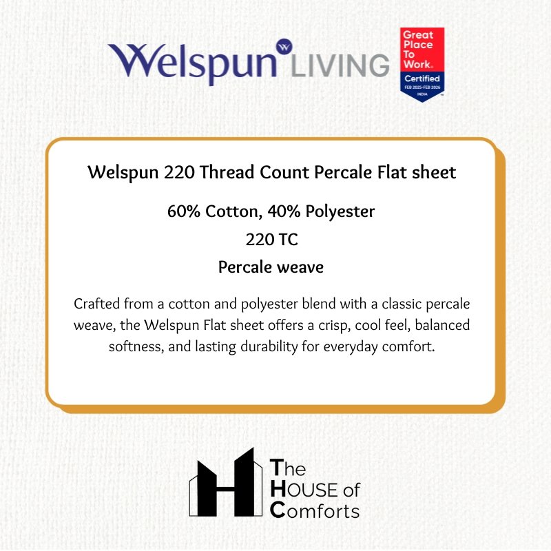 Experience the luxurious comfort of the Welspun 220 Thread Count Percale Flat Sheet. Crafted from a blend of 60% cotton and 40% polyester, this sheet offers a soft, breathable feel while maintaining a crisp, cool touch against your skin. The classic percale weave creates a smooth surface, promoting a restful night’s sleep. The 220 thread count contributes to a luxuriously soft and substantial feel, perfect for a comfortable night’s rest. Enjoy the perfect balance of softness and durability, designed to keep you cool and comfortable all night long.