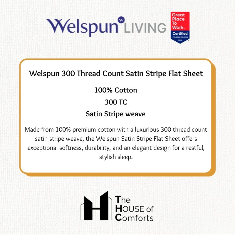 Experience the luxurious comfort of a Welspun 300 Thread Count Satin Stripe Flat Sheet. Made from 100% premium cotton with a beautiful satin stripe weave, this sheet provides a soft, smooth feel against your skin. The high thread count (300) ensures exceptional durability and a luxurious feel, while the satin stripe design adds a touch of sophistication to your bedroom. Enjoy a comfortable and stylish sleep experience that’s built to last.