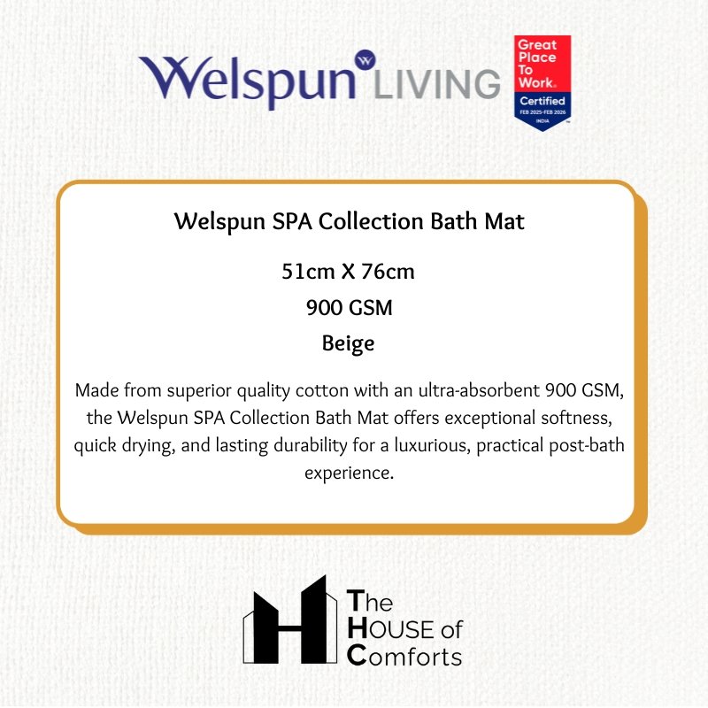 Indulge in ultimate comfort and practicality with the Welspun SPA Collection Bath Mat. Crafted from superior quality cotton with a GSM of 900, this beige bath mat boasts remarkable softness and absorbency. Its luxurious feel is complemented by exceptional durability, ensuring long-lasting use. The high GSM guarantees quick drying and keeps your feet comfortably dry after your bath or shower.